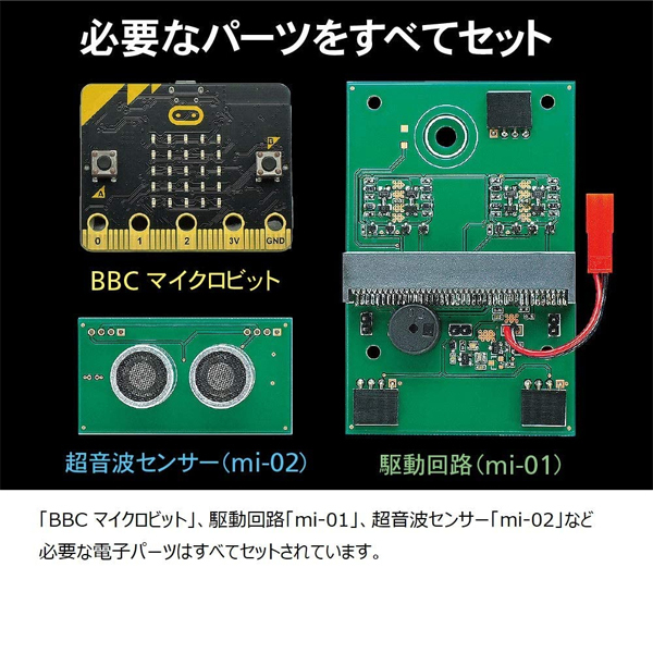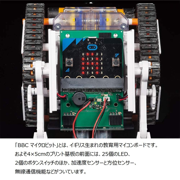 教育用マイコンボード『BBCマイクロビット』、超音波センサー、駆動回路を搭載した、クローラー走行のロボット工作セット。