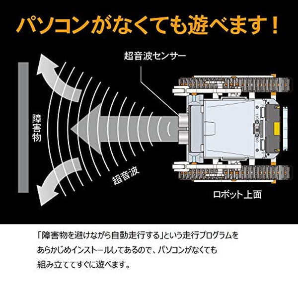『超音波センサーで障害物を避けて動く』という走行プログラムがインストール済みであるため、組み立ててすぐに遊ぶ事が可能。