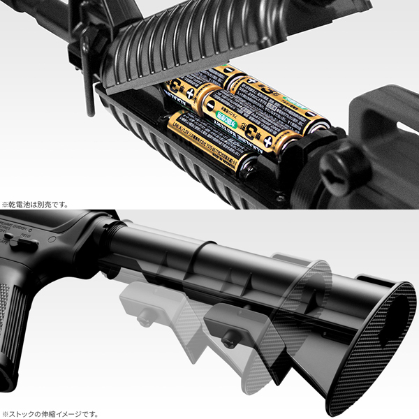 サイズ/仕様:全長:652mm/724mm(ストック伸長時)、重量:1030g(空マガジン、電池含む)、弾丸:6mmBB(0.12g)、動力源:単三電池×6本使用(別売り)、装弾数:180+28発(28発は本体BBレール収容分)、種類:アサルトライフル セット内容:M4A1本体、マガジン(装弾数180発)、保護キャップ、取扱い説明書、BB弾(0.12g/100発)、他