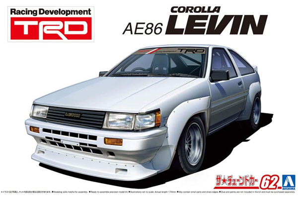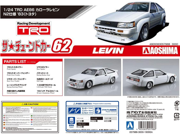 青島文化教材社「1/24ザ・チューンドカーシリーズNo.62トヨタTRD AE86カローラレビンN2仕様1983」のプラモデルです。