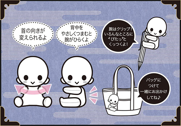 背中をつまむと腕がひらいて、いろんなものに抱きつくよ!顔の向きを変えればくっつく場所も選ばないスグレモノ♪可愛い「ぴたぬい」たちとステキな時間をすごしてね☆