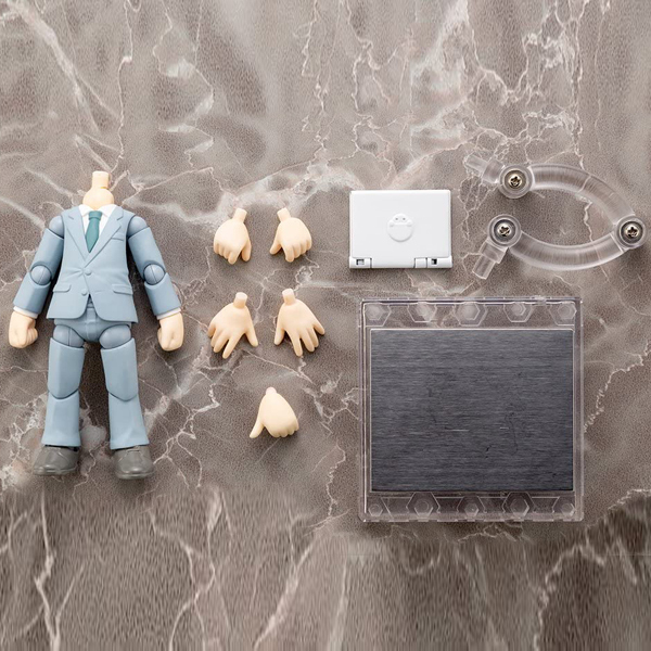 フレッシュで清潔感溢れるグレーのスーツと足元までお洒落に気を使った出来る男風ボディにはビジネスマンに必須のノートパソコン(白)が付属!製品に頭部は付属しないので、お手持ちの「キューポッシュ」で遊んでくださいね♪<セット内容>スーツボディ本体(頭部なし)、ノートパソコン、差替え用手首(平手・握り手・持ち手・ノートパソコン用持ち手)、クリアー台座&支柱(足裏マグネット対応)