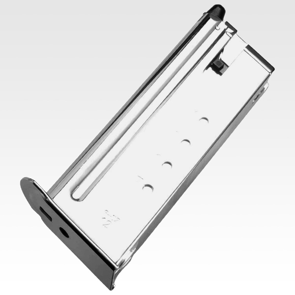 サイズ/仕様:全長:270mm、銃身長:136mm、重量:1110g、弾丸:6mmBB(0.2〜0.25g)、動力源:専用ガス、装弾数:27発+1発(1発は本体に装填した場合)、種類:ハンドガン(オートマチック)