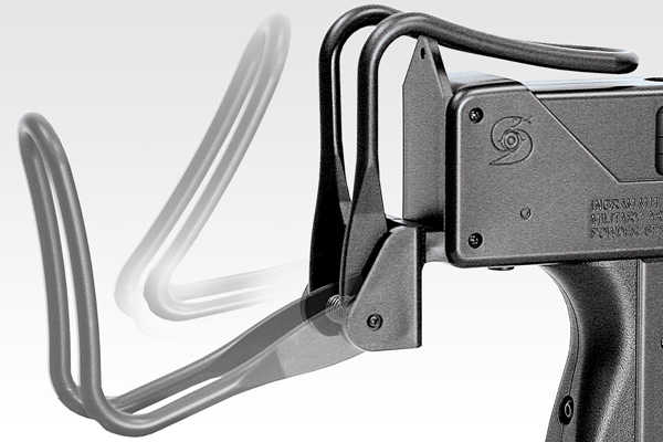 大型ハンドガンほどのサイズにもかかわらず、マック10よりさらに連射速度に優れ、収納されているストックを使用すれば、フルオートでも安定した発射が可能になっています。