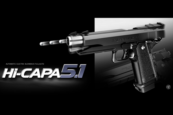 電動ブローバック・フルオートに待望の「ハイキャパ5.1」登場!!単四アルカリ電池でフルオート連射&ブローバックアクションを再現。