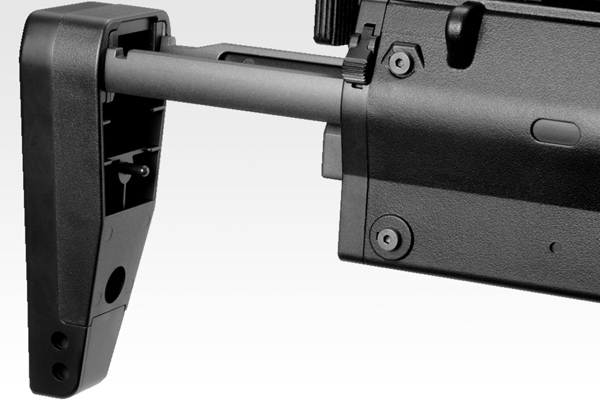 PDW(パーソナル・ディフェンス・ウェポン)というカテゴリーに属するこのモデルは、負傷や機材運搬中などで片手がふさがっている場合でも、即座に、そしてカンタンな操作でフルオート発射ができることを前提に開発されています。