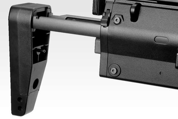 PDW(パーソナル・ディフェンス・ウェポン)というカテゴリーに属するこのモデルは、負傷や機材運搬中などで片手がふさがっている場合でも、即座に、そしてカンタンな操作でフルオート発射ができることを前提に開発されています。
