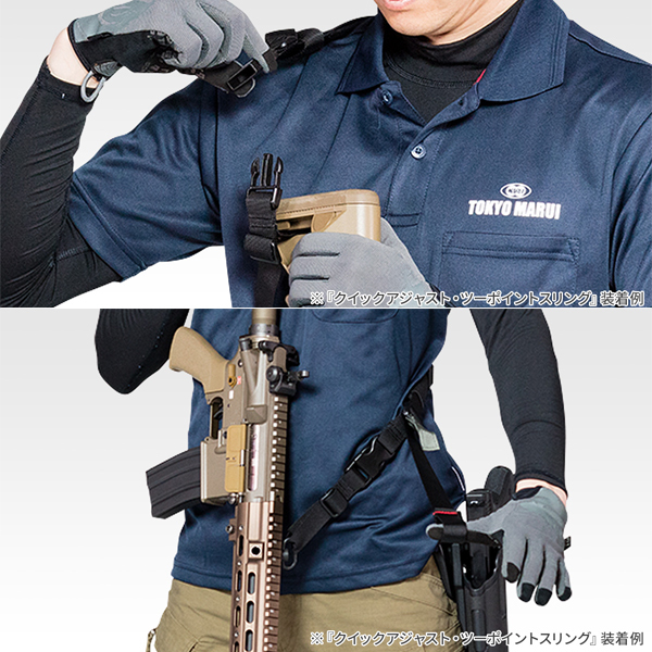 移動時や、マガジンチェンジ時、サブウェポンへの持ち替え時など、エアソフトガンの重さを両手だけでなく肩でも支えることができます。