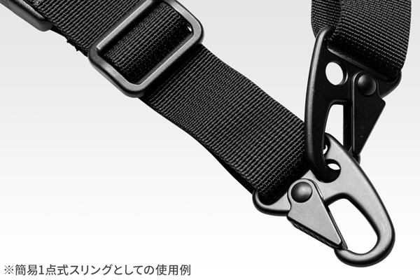 ベーシックな2点式スリングとしての使用はもちろん、リア側のフックにあるホールへフロント側のフックを取り付けることで、簡易的にワンポイントスリングとして使うことができます。