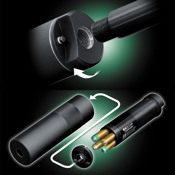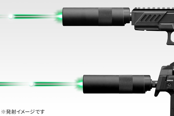 発射したBB弾が光り、レーザーのような弾道をえがきます(「NEW発光BB弾」が別途必要です)。