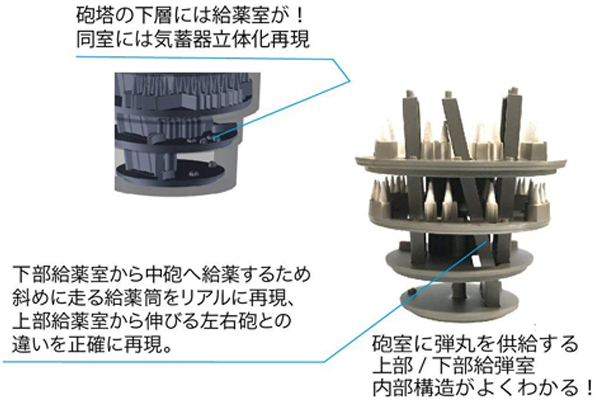日本海軍が建造した世界最大の戦艦大和型「搭載主砲」!末期の25ミリ3連装機銃座が設置されたタイプを製品化!1/200というビックスケールで、砲塔および最上甲板下の上下給弾室など主砲支筒を含む主砲塔一式が再現できます。